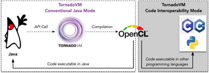 Note: The code interoperability is prototyped as a complementary mode to enable TornadoVM-generated kernels to be transferable for execution from other programming languages, beyond Java.