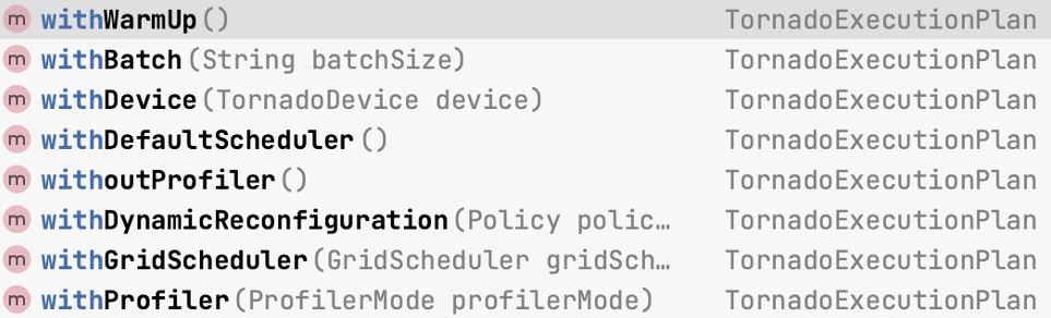 The TornadoVM API is designed to aid Java programmers in adapting their code bases for hardware acceleration. As explained in a previous article, the TornadoVM API exposes two key Java objects for programmers, the TaskGraph and the TornadoExecutionPlan. The former is used to define which methods should be offloaded on an accelerator as well as how often the data will flow. The latter is used to configure how the execution will take place (e.g., with a warmup, with a specific grid, with a profiler, etc.) and contains a method that actually invokes the execution. More information about how to use those objects are provided here.